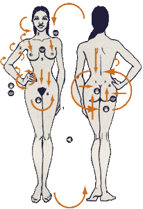 (Первый и последний рисунки взяты из журнала 20ANS. Они иллюстрируют варианты эротического массажа для женщин. Стрелки указывают направление движения.)