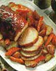 | Из свиного окорока удалить кости, нашпиговать его чесноком и луком, посыпать молотым перцем, натереть солью, положить в керамическую или эмалированную посудину, добавить лавровый лист, залить все хлебным квасом или уксусом, положить сухую мяту и поставить на 12 часов на лед для маринования. Через каждые 3-4 часа переворачивать мясо с одного бока на другой. Маринованный окорок вынуть из маринада, положить в сотейник, поставить в духовку и жарить до готовности. Готовый окорок нарезать порционными кусками и подать с картофелем и овощами, полив соком, в котором жарилось мясо.