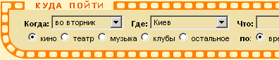 Мы готовим для Вас ежедневную программу кинотеатров, театров, концертов и клубов Киева и регионов. Для того, чтобы узнать что, где и когда идет сегодня, завтра, послезавтра, зайдите на главную страницу Развлечений и задайте день, город и тип программы в форме "Куда пойти" вверху страницы: